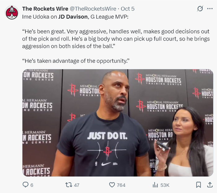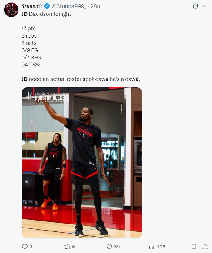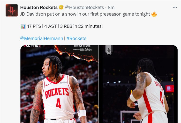 火箭官方:JD-戴维森代表火箭的赛季首秀非常出色,22分钟拿到17+5个三分球。