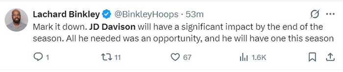 火箭队记兰德里-宾克利暗示赛季末会转正戴维森,他写道:等着看吧,杰德-戴维森在本赛季末将产生重大影响,他所需要的只是一个机会,而这个机会本赛季他就能得到。
