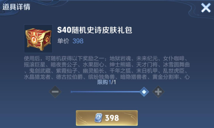 此外赛季商店中还有一个随机史诗皮肤宝箱,这个宝箱每个赛季都可以购买,价格398点券,随机获得一款史诗皮肤。
